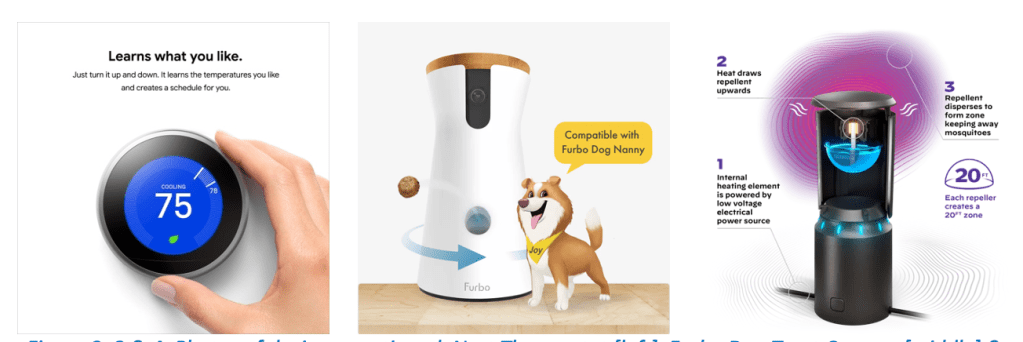 Figure 2, 3 & 4: Photos of devices mentioned, Nest Thermostat [left], Furbo Dog Treat Camera [middle] & Thermacell LIV Smart Mosquito Repellent [right]. See source [15].